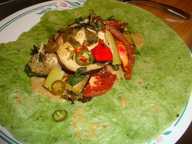 In addition to my lunch and smoothie, I had some roasted veggies that were thrown into a spinach wrap.
