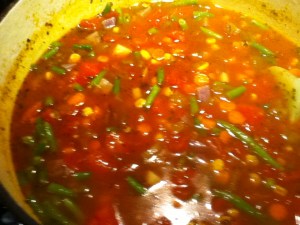 Then, add in the jar of El Pinto Hot Green Chile Sauce and the 2 cans of fire roasted chopped tomatoes (I prefer Muir Glen). Stir these all together for several minutes and then add you potatoes, corn, and green beans.