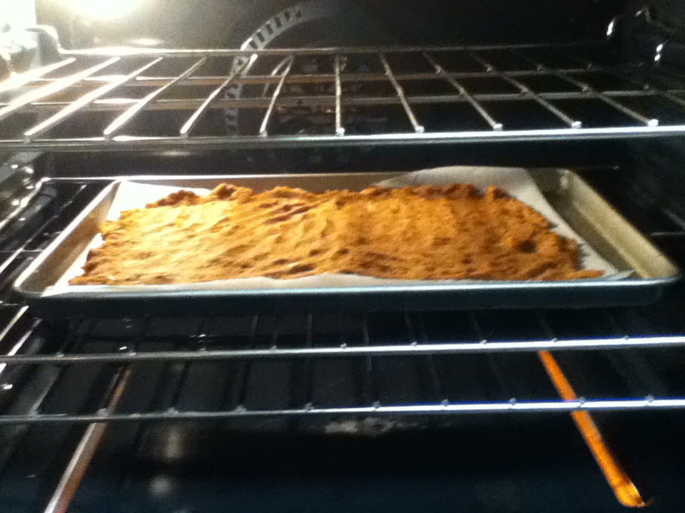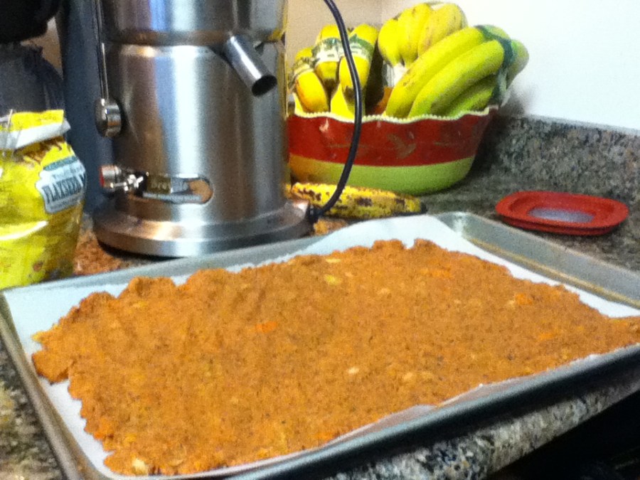 once everything is mixed together thoroughly, spread out the pulp on a piece of parchment paper on a cookie sheet.  You want to spread out the pulp to an even thin layer.  On my first try the layer was a little too thick, so my crackers are more chewy than crispy.