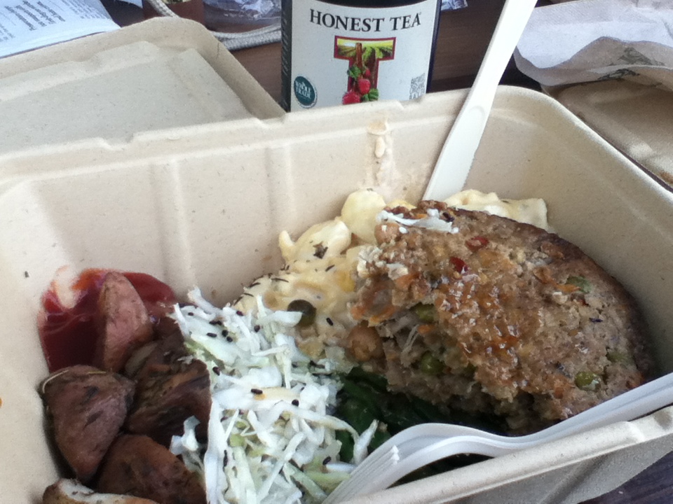 I enjoyed some roasted potatoes, toasted sesame slaw, a veggie burger, roasted green beans, and vegan samosas. I was eye-ing up some tofu (a very rare occasion) and this guy was standing near an empty food tray on his tip toes looking for someone… he was looking for the cook bringing the new food tray of samosas. I watched this guy put about a dozen of these in a to go box, so I figured they had to be good! THEY WERE!