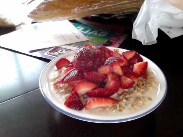 I bought a flat of organic strawberries for 9.99 and practically danced while hulling them! I’ve been waiting to find some good organic strawberries! So, for dinner I had a bowl of Kashi Go Lean Crunch with a mountain of strawberries: