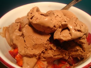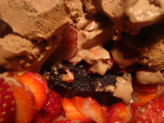 I didn’t have a birthday cake, instead I bought another quart of organic strawberries, a vegan brownie from Whole Foods and a pint of So Delicious Dark Chocolate Coconut Ice Cream.  I had half the brownie, 1.5 cup of sliced strawberries and a scoop of ice cream two nights in a row: