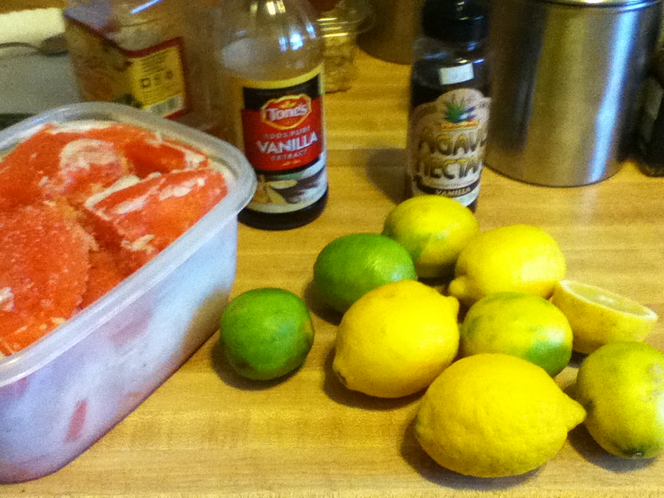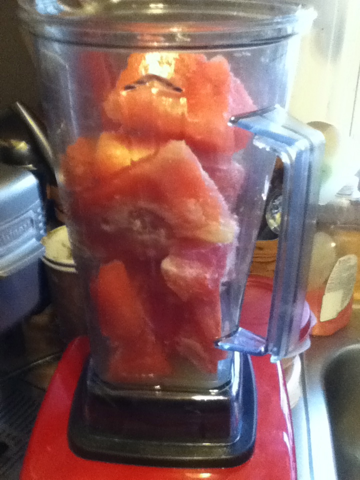 You will want some frozen watermelon (you could non-frozen watermelon and it’ll be more watermelon juice like… unless you add ice), lemons and limes (optional), vanilla extract and agave nectar or unrefined sugar. It’s also good to add some mint!