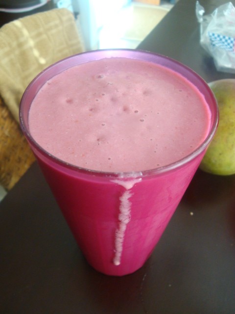 (coconut milk, strawberries, raspberries, frozen banana, splash of vanilla, Vanilla Raw SunWarrior Protein Powder, agave nectar for taste)