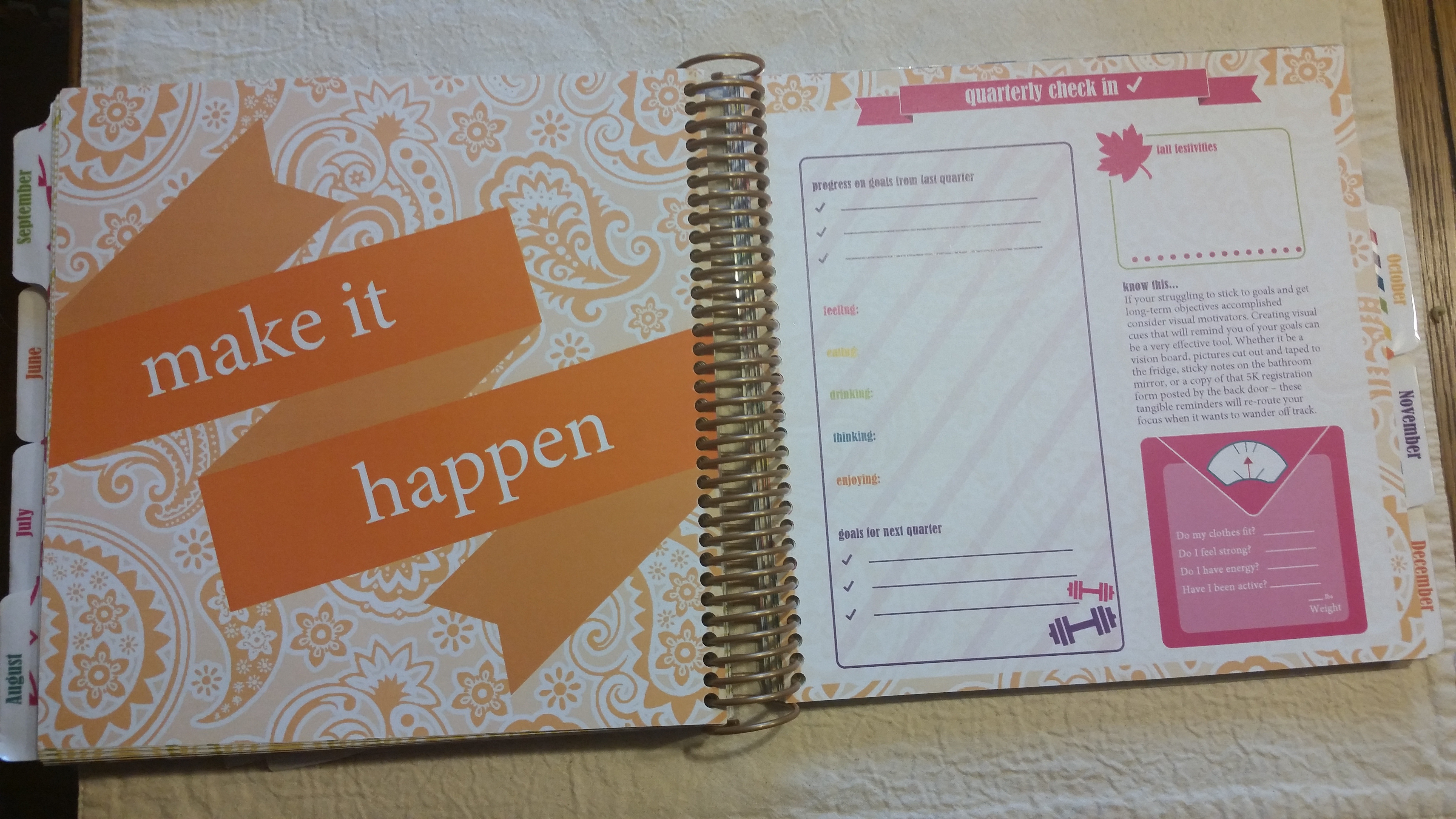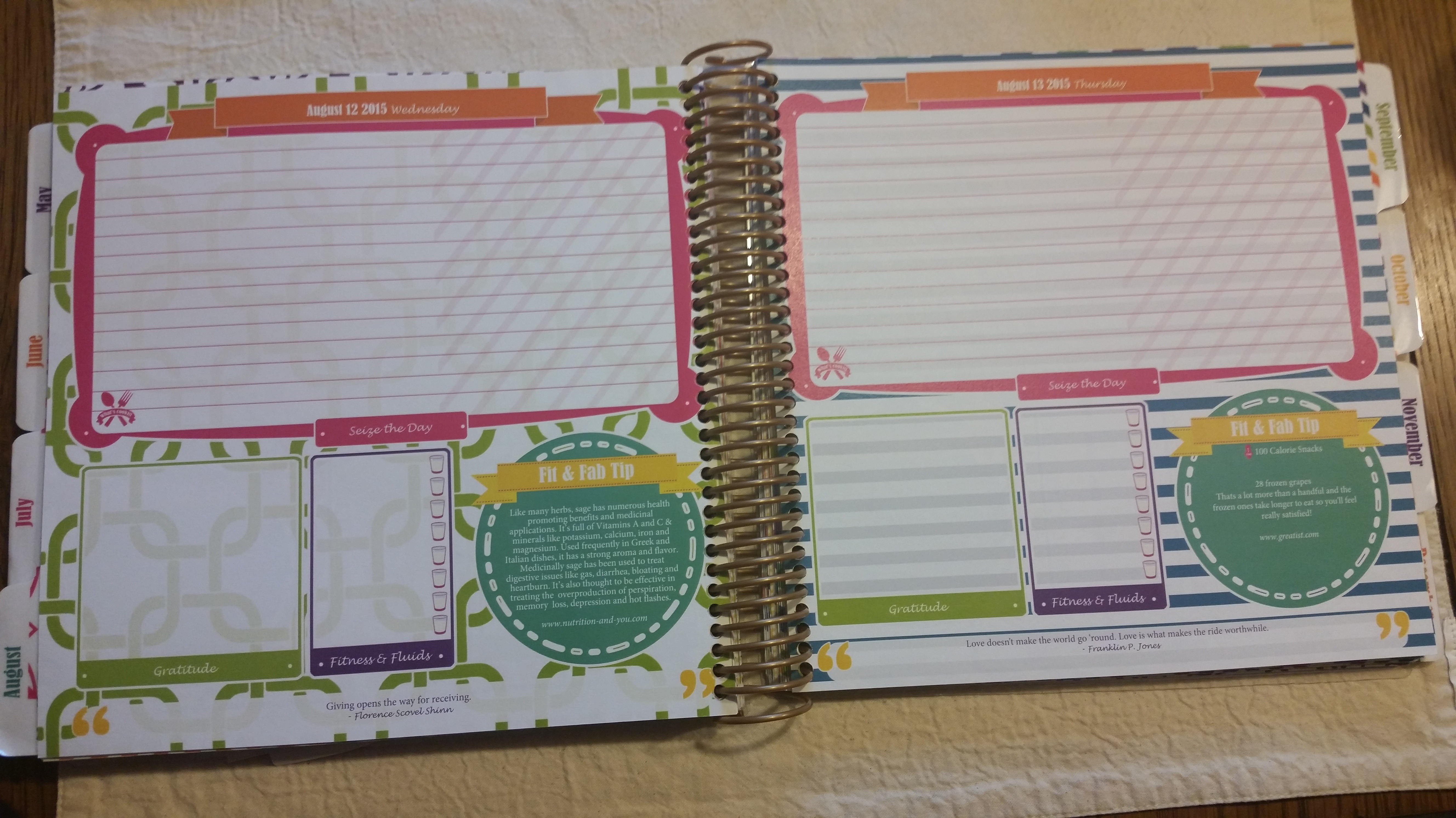On each day you have a spot for you Gratitude and Fitness & Fluids. Honestly, I haven’t consistently written in those spots. I use an app to keep track of my fluids and write my workouts in on the space above. It’s easy to separate the larger space due to the diagonal lines on the right hand side. I do enjoy the daily quotes and the Fit & Fab Tips are neat to read.